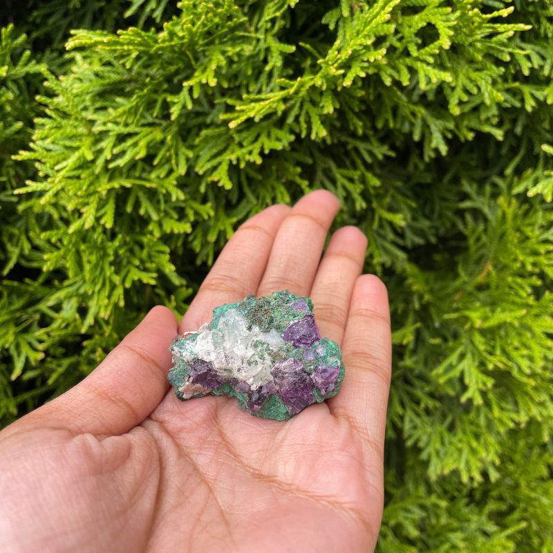Contrasting hues of deep green Malachite and translucent to violet Fluorite create a striking display for altars, crystal grids, or personal collections.